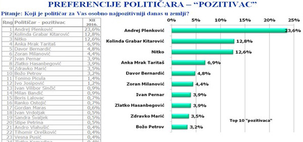 Na vrhu ljestvice pozitivnog doživljaja hrvatskih političara je premijer Andrej Plenković s izborom 23,6% ispitanika. Na drugom je mjestu predsjednica Kolinda Grabar-Kitarović s 12,8%. Treće mjesto drži "nitko" s izborom od 12,6%, a slijede ostali političari.