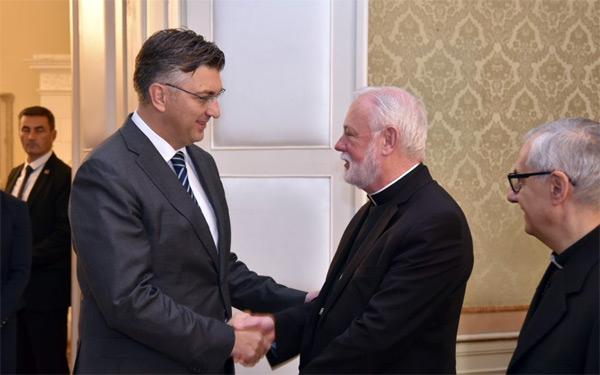 Predsjednik Vlade Andrej Plenković i nadbiskup Gallagher ocijenili su odnose i suradnju Hrvatske i Svete Stolice vrlo dobrima, kao i privrženost Vlade provedbi Vatikanskih ugovora. U tom kontekstu osvrnuli su se i na posjet predsjednika Vlade Svetoj Stolici i sastanak sa Svetim Ocem papom Franjom, 7. listopada prošle godine. Uvodno je predsjednik Vlade Plenković kazao kako Republika Hrvatska podržava aktivnosti Svetoga Oca u njegovom pontifikatu, pri čemu posebno cijeni njegove snažne poruke nade, mira i kršćanske solidarnosti najugroženijim državama i dijelovima svijeta.