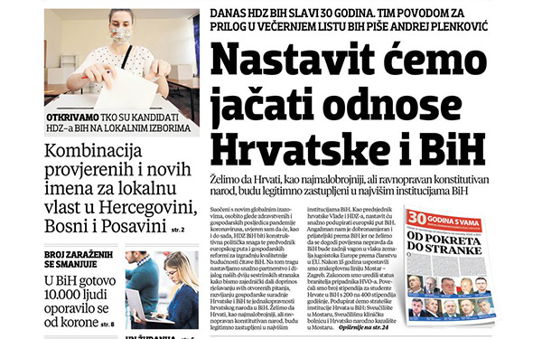 U članku koji je objavio u bosanskohercegovačkom Večernjem listu premijer Andrej Plenković čestitao je Draganu Čoviću te članicama i članovima HDZ-a BiH 30. obljetnicu osnutka stranke