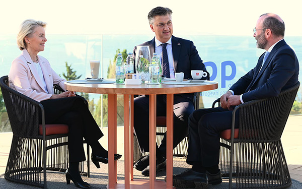 Ususret zajedničkog sudjelovanja na panelu pred EPP grupom, na zajedničkoj konferenciji za medije sudjelovali su premijer Plenković, predsjednik EPP-a Weber i predsjednica EK von der Leyen.