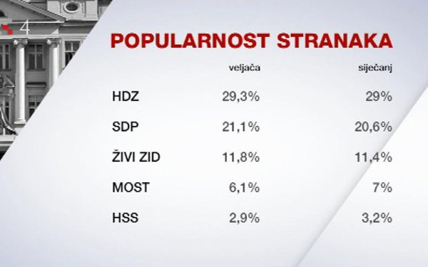 Prema redovitom istraživanju CRO Demoskop HDZ u veljači bilježi potporu od 29,3 posto, dok SDP-ov rejting iznosi 21,1 posto