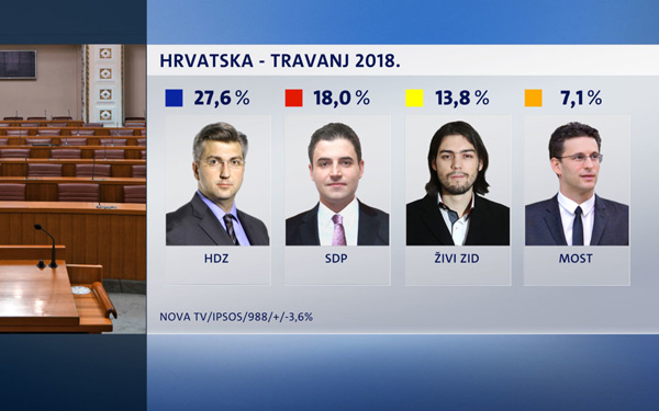 Potpora vodećem HDZ-u u travnju iznosi 27,6 % (u ožujku 29,5%), dok je SDP drugi s podrškom od 18% (u ožujku 19,3%), a slijede Živi zid sa 13,8% (u ožujku 12,9%) i MOST sa 7,1% (kao i u ožujku), HSS sa 4,6%, Bandić Milan 365 sa 3% potpore te ostale stranke.