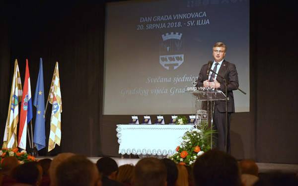 Pozdravljajući okupljene, predsjednik Vlade Plenković naglasio je da u ovoj prigodi Gradu Vinkovcima, Vukovarsko-srijemskoj županiji i cijeloj Slavoniji želi poslati poruku zajedništva i partnerstva. „Slavonske županije zaslužuju ispruženu ruku potpore, podrške, suradnje i investiranja kako bi Slavonija bila jedan od generatora razvoja zemlje, kako bi naši mladi ljudi ostali ovdje, na svojoj zemlji i u svom domu zasnivali obitelji!“, kazao je Plenković izrazivši želju da mandat ove Vlade bude obilježen jednim posebnim projektom, a to je projekt Slavonija.