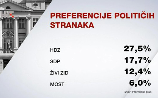 Prema istraživanju CRO Demoskop u listopadu na vrhu ljestvice preferencija političkih stranaka nalazi se HDZ s izborom od 27,5 posto ispitanika (prema 27,2 posto iz rujna). SDP je drugi i bilježi potporu od 17,7 posto (prema 18,1 posto iz rujna), a slijede Živi zid s izborom od 12,4 posto (prema 12,7 posto iz rujna) i MOST sa 6 posto (prema 6,8 posto iz rujna) te ostale stranke. Neodlučnih birača je 13,1 posto.