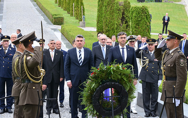Vijence su na zajedničku grobnicu za neidentificirane žrtve iz Domovinskog rata, pred spomenikom "Glas hrvatske žrtve – Zid boli" te pred Središnjim križem branitelja zajednički položili predsjednici Republike, Vlade i Hrvatskog sabora Zoran Milanović, Andrej Plenković i Gordan Jandroković. Potom su predsjednici Vlade i Hrvatskog sabora, bez predsjednika Republike, položili vijence i na grob prvog hrvatskog predsjednika dr. Franje Tuđmana.