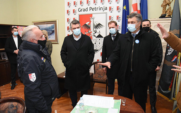 Premijer Andrej Plenković, uz predsjednika Republike Zorana Milanovića i predsjednika Hrvatskog sabora Gordana Jandrokovića, posjetio je Sisak i Petrinju nakon snažnog potresa koji je pogodio Sisačko-moslavačku županiju
