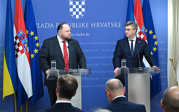 Stefančuk je na tiskovnoj konferenciji s hrvatskim premijerom zahvalio Andreju Plenkoviću na prošlotjednom "predivnom govoru" u ukrajinskom parlamentu, a svom kolegi Gordanu Jandrokoviću na preuzimanju organizacije skupa u Zagrebu koji će okupiti pedesetak parlamentarnih delegacija, među njima i američku, koju predvodi Nancy Pelosi. "Slava Ukrajini, slava Hrvatskoj", zaključio je Ukrajinac.