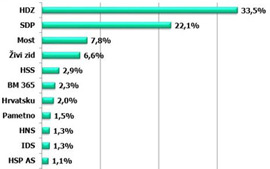 Redovito istraživanje CRO Demoskop pokazuje da je HDZ po završetku prve godine rada Vlade u uvjerljivom vodstvu s potporom od 33,5 posto, dok SDP-ov rejting iznosi 22,1 posto