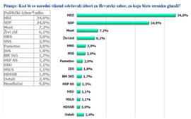 Prema istraživanju CRO Demoskop za lipanj HDZ uživa potporu 34% građana (prema 30,8% iz svibnja), a premijer Andrej Plenković najpozitivniji je političar po izboru 16,3% ispitanika
