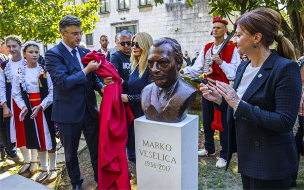 Predsjednik Vlade Andrej Plenković u Sinju je otkrio bistu dr. sc. Marka Veselice uz sudjelovanje gradonačelnice Kristine Križanac i članova Veseličine obitelji