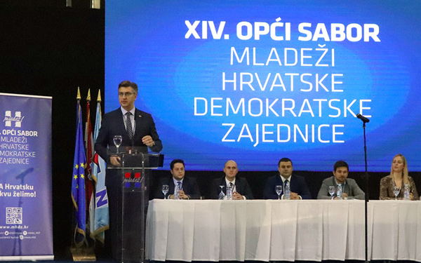 Predsjednik Vlade i HDZ-a Andrej Plenković održao je govor na Izbornom saboru Mladeži HDZ-a, na kojemu je više od 500 izaslanika izabralo Ivana Vidiša za novog predsjednika