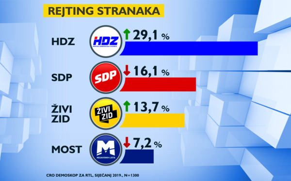 Prema istraživanju CRO Demoskop HDZ u siječnju ima potporu od 29,1 posto, dok SDP-ov rejting iznosi 16,1 posto