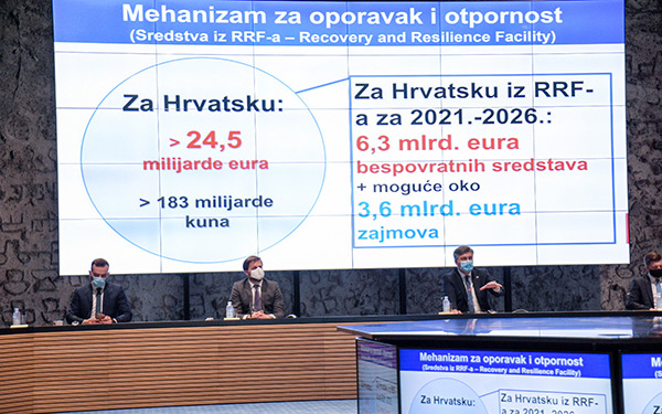 Predsjednik Vlade Andrej Plenković predstavio je danas u Hrvatskom saboru Nacionalni plan oporavka i otpornosti 2021–26. te izjavio da će Hrvatskoj u idućih sedam godina biti na raspolaganju 30 milijardi eura odnosno 227 milijardi kuna
